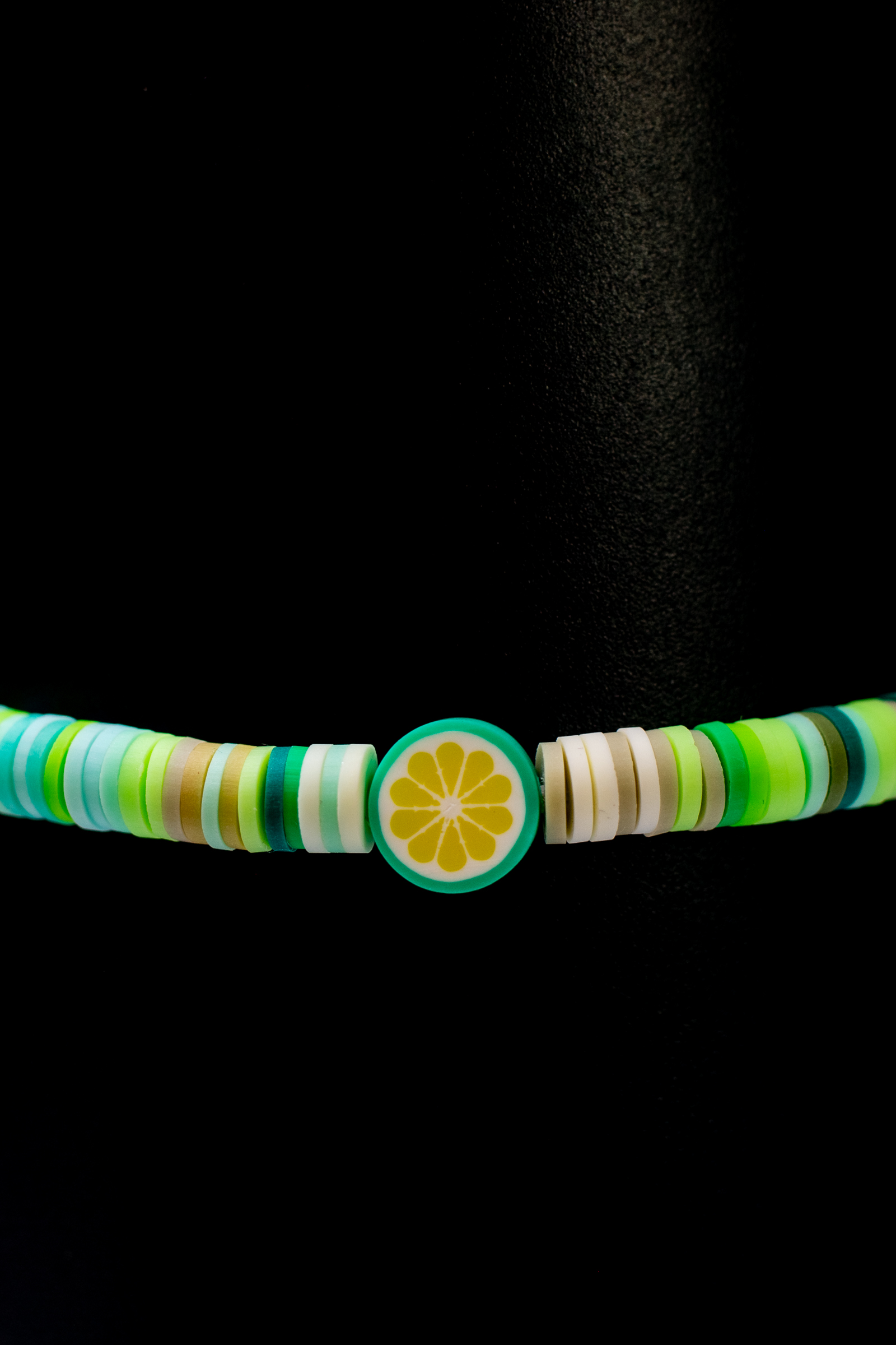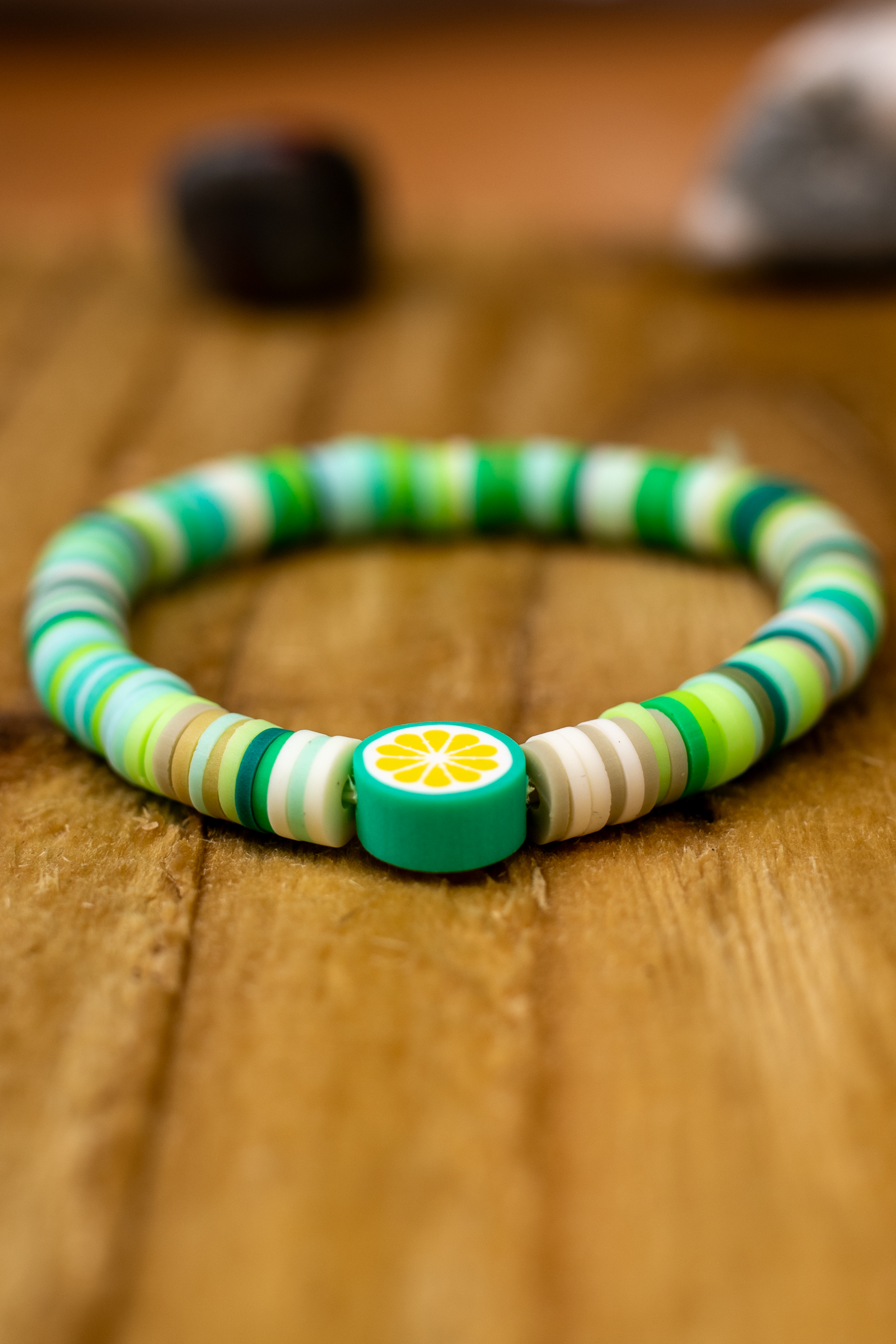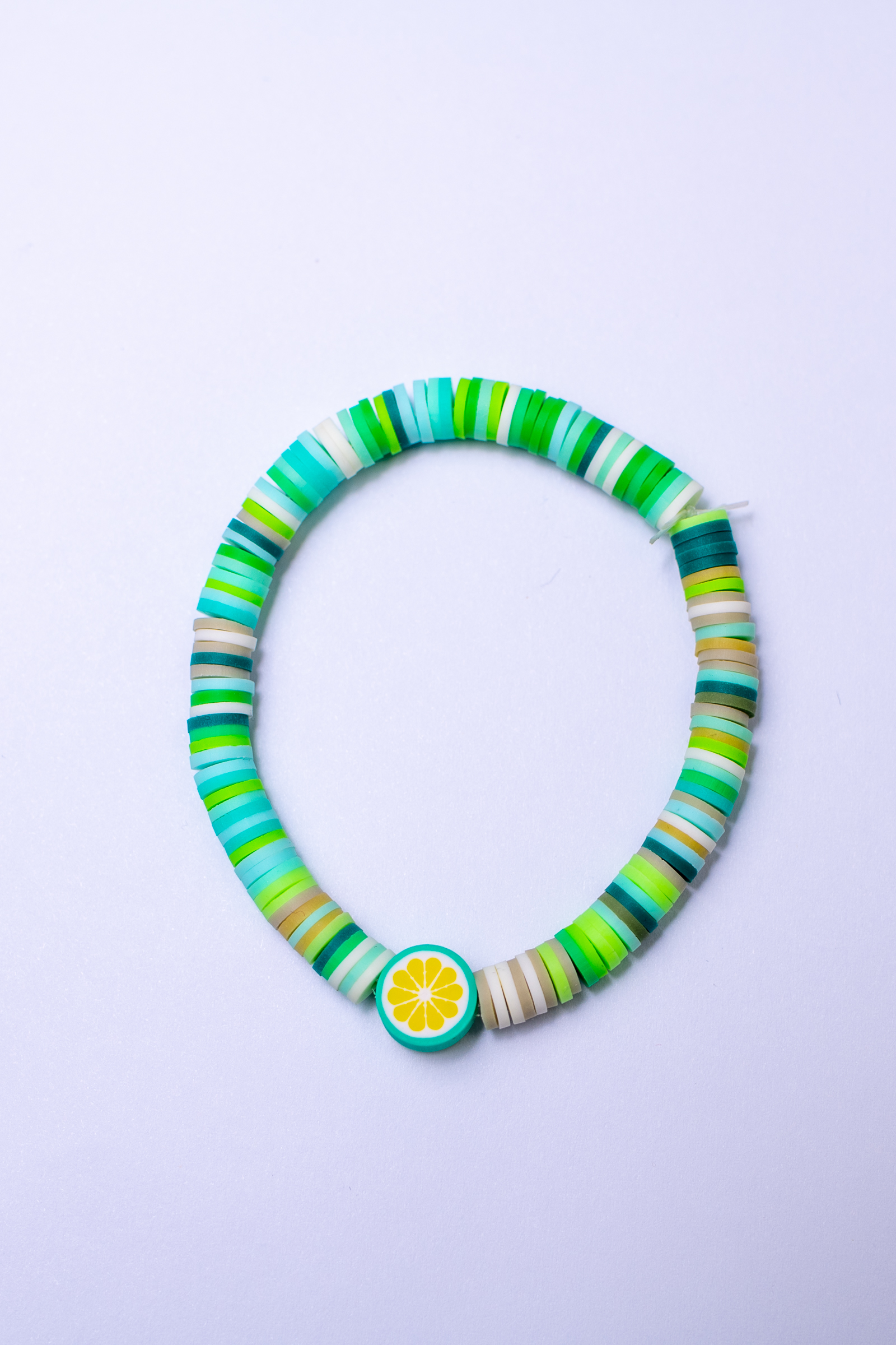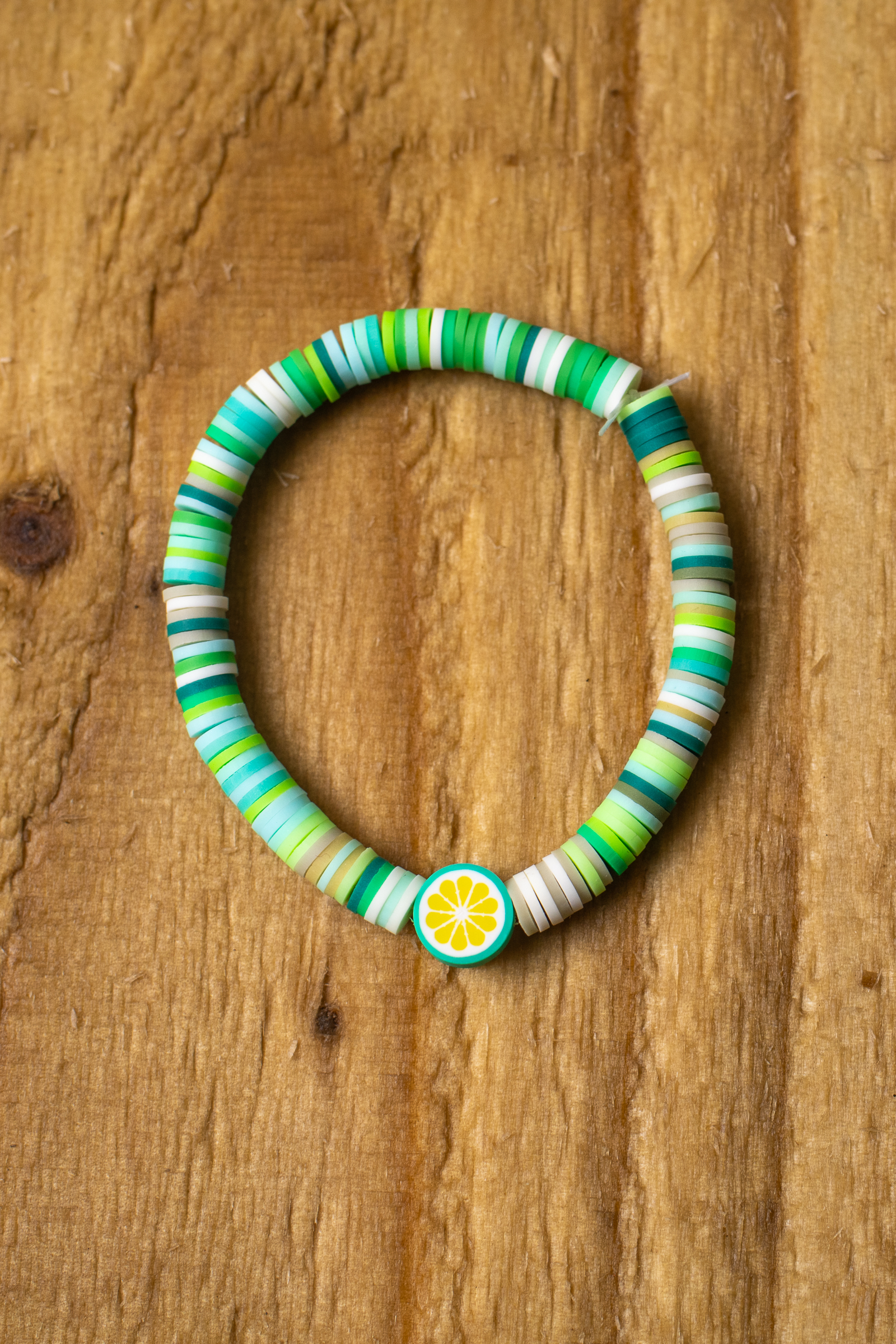 Add a splash of color and fun to your jewelry collection with this vibrant handmade clay bead bracelet. Each bracelet is crafted to order, featuring a mix of soft greens, blues, and earthy tones for a lively yet natural look. At the heart of the design is a playful lemon charm, adding a touch of citrusy brightness that’s perfect for any season.